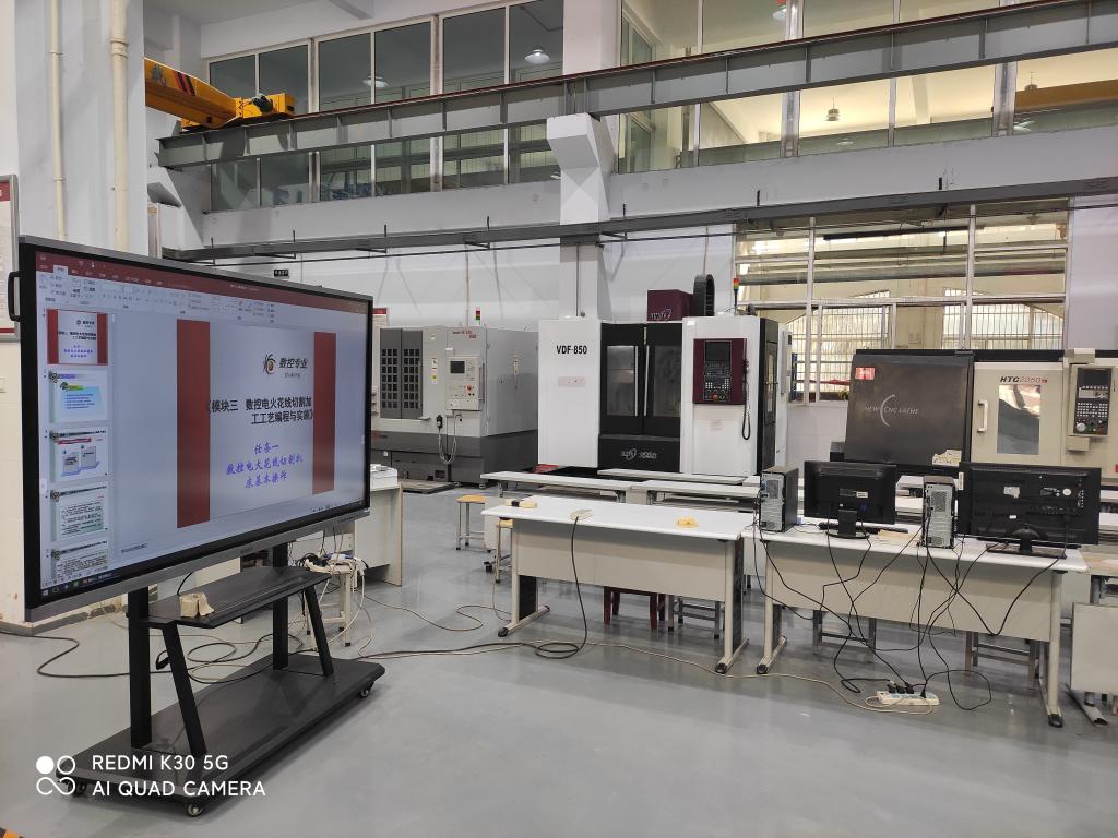 实训中心共6个,包括数控模具、自动化生产线、工业控制等实训中心,数控维修,3D打印等实训室,总价值800多万。其中高端智能制造设备6台(全功能数控车1台,四轴加工中心3台,五轴加工中心2台),自动化生产线实训台6台套,工业机器人6台套。