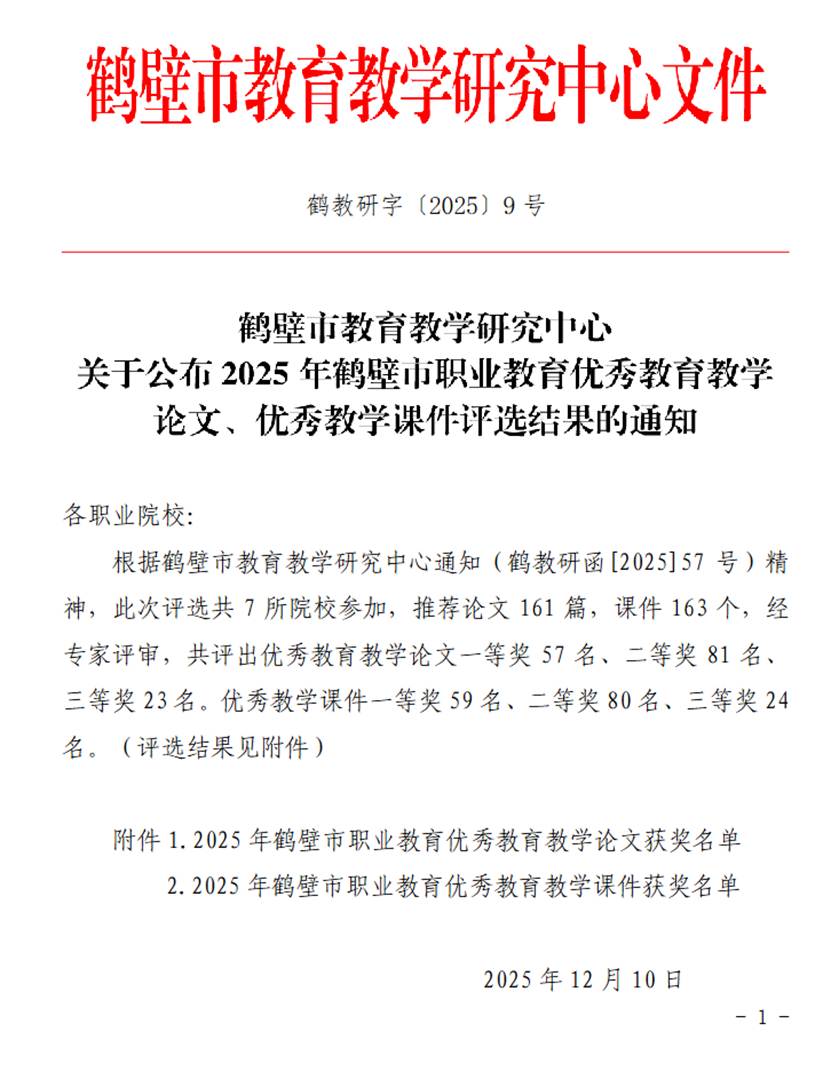 近日,2025年度鹤壁市职业教育优秀公司产品论文评选结果揭晓。米兰·(milan)体育官网在此次评选中取得优异成绩,共斩获两项一等奖,彰显了学院在公司产品研究领域的深厚积淀与创新活力。此次获奖不仅是对教师个人教研能力的充分肯定,也是学院持续推动教学改革、提升人才培养质量的生动体现。