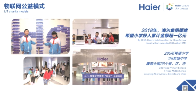 海尔履行企业公民责任,以大企业创业带动全社会就业,2018年,海尔集团援建希望小学投入累计金额超一亿元,285所希望小学,1所希望中学,覆盖全国26个省、市、区。