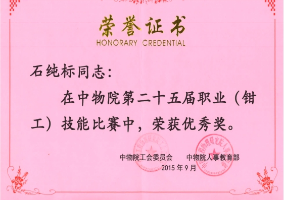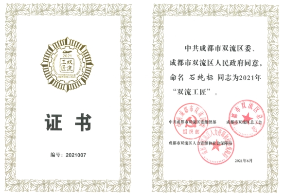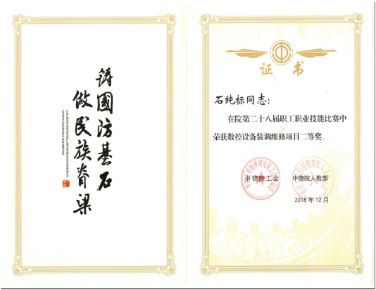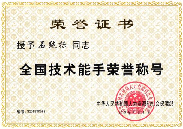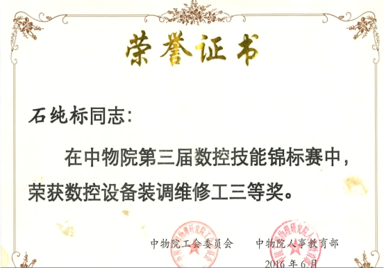 2012年石纯标在校期间获得全国职业院校技能大赛数控机床安装检测调试与维修国赛一等奖,2015年参加中物院第二十五届职业钳工比赛获得优秀奖,2016年参加中物院第三届数控技能锦标赛数控装调维修工比赛获得三等奖,2018年参加四川省青年职业技能大赛钳工比赛获得三等奖,在2018年度职业技能竞赛的第八届全国数控技能大赛中获“全国技术能手”荣誉称号,2021年获得“成都工匠”“双流工匠”荣誉称号。