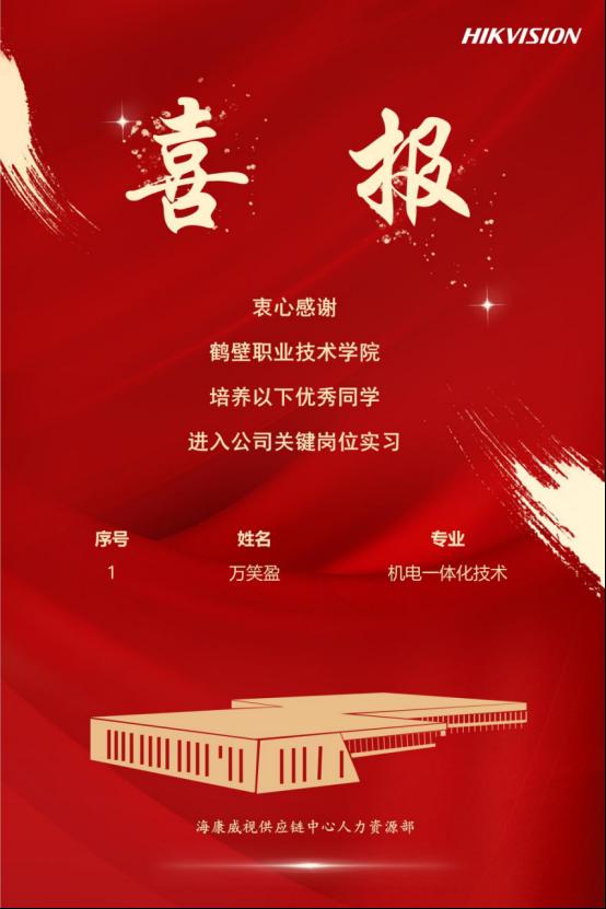 10月25日,米兰·(milan)体育官网收到浙江杭州海康威视供应链中心人力资源部发来的喜报,表彰公司2022级高职机电一体化技术1班万笑盈同学。该同学入职以来工作积极主动,热爱学习,主动学习其他岗位工作,掌握了3个岗位的工作,并且在关键岗位缺人时主动顶岗,且较好的完成了该岗位工作职责;质量意识较强,入职以来未出现过质量异常;谦虚认真的工作态度,得到团队同事的好评;在完成本职工作的情况下,主动学习其他岗位技能,为其他新员工树立榜样作用。